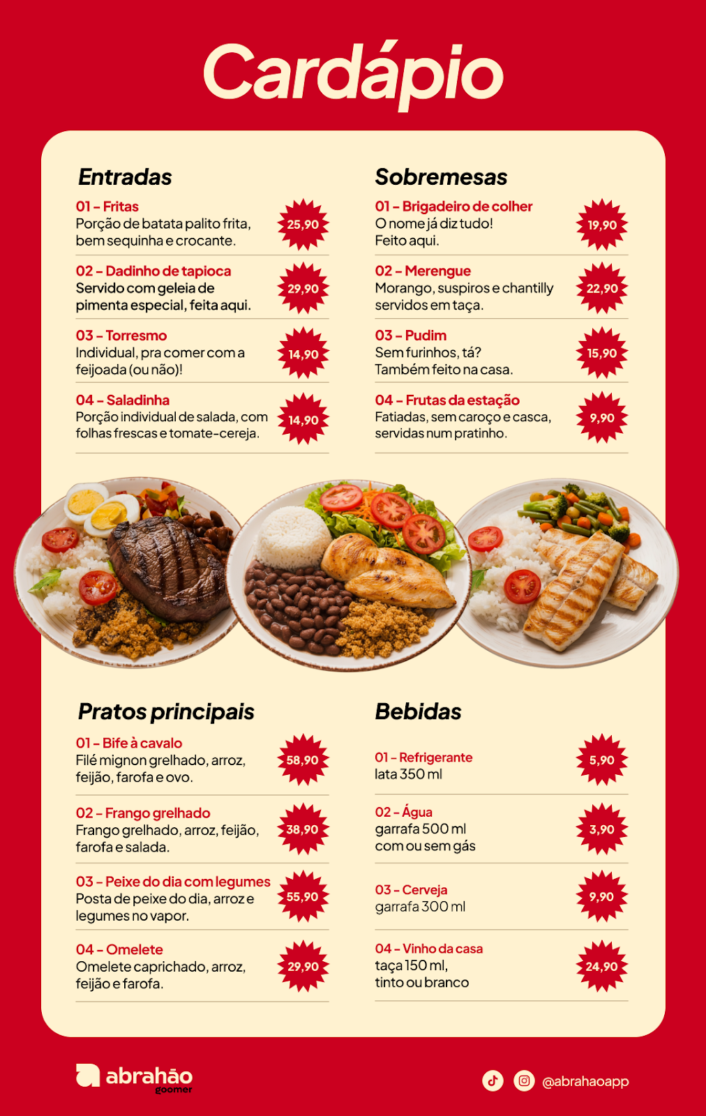 Um menu vendedor é organizado, fácil de visualizar e tem fotos reais dos produtos. Só pra começar, hein!